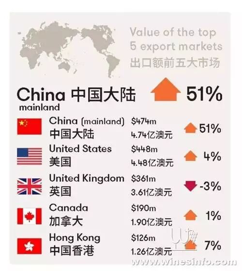 截止到2016年9月底发布的数据,澳大利亚葡萄酒对中国大陆出口总额首次超过美国,中国大陆成为澳大利亚葡萄酒出口的第一大市场。从出口额来看,澳大利亚葡萄酒对中国大陆增长了51%至4.74亿澳元,而在十年前,这个数字仅为0.27亿澳元,翻了近20倍。出口量则增长了52%至9千万升。瓶装酒出口也保持着迅猛的增长,出口额增长48%至4.46亿澳元。