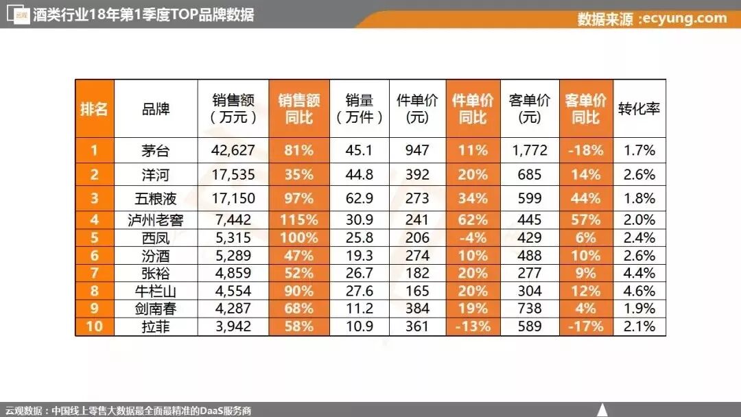 日前,云观数据发布2018年第1季度天猫各行业TOP10品牌数据及同比报告。报告显示,2018年第一季度,茅台品牌销售居于首位,达4.26亿元,同比增长81%;产品平均售价(件售价)达947元,同比增长11%。洋河、五粮液分别为局第二、三位,品牌销售额为1.75亿元及1.72亿元。