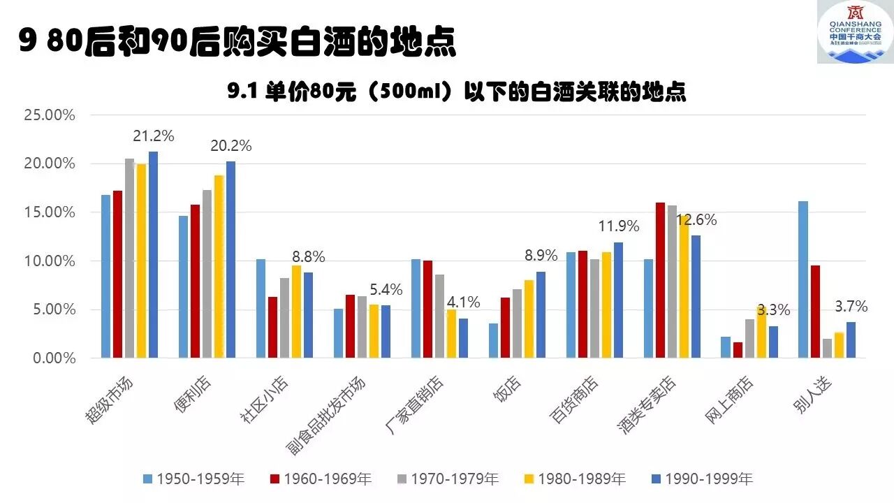 对于买酒的渠道场合,分析认为,90后首选是超级市场,之后是便利店,排在第三位是酒类专卖店。80后依次也是超级市场、便利店、酒类专卖店。电子商务方面依赖较低,大家对白酒电子商务不妨冷却一下大脑。80、90后两个新生代网购酒的依赖显著低于书和电子类产品。