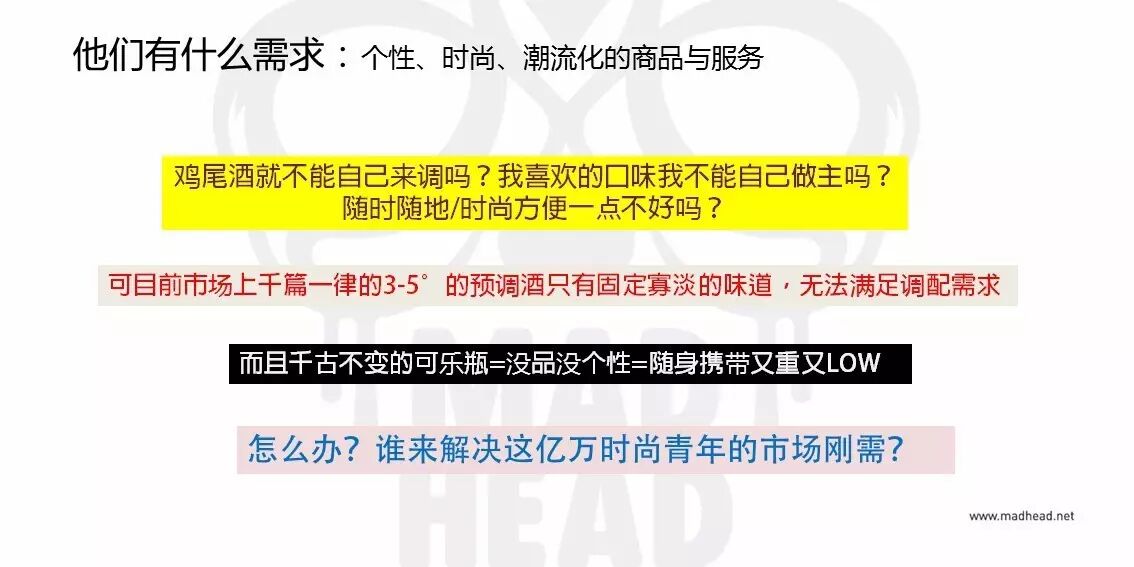 “2011年我们开始做酒,2012年,我们又决定在鸡尾酒市场分一杯羹,但我们决定发挥差异化的竞争优势,在鸡尾酒细分市场上主打自调鸡尾酒的概念,针对目标是年轻消费者开发一些特别的、别致的鸡尾酒。所以我们打造了国内第一款潮牌利口酒。”盛磊说。
